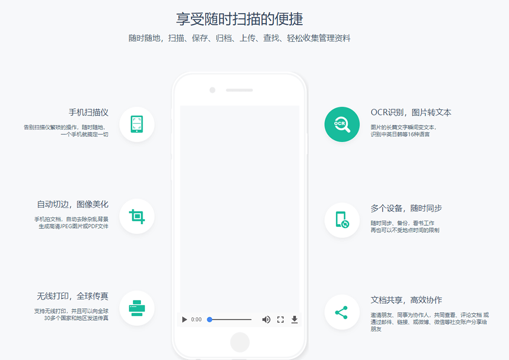 扫描全能王提供最智能的文档管理方案。手机、平板、电脑变身随身携带的扫描仪、文件库,随时随心编辑,文档快速同步,时时分享,有效沟通。