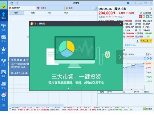全面支持三大市场行情,A股、港股、美股一网打尽!富途牛牛同时支持港股、美股交易,为投资者提供免费实时行情及完整交易明细,助你轻松把握股市大势。简洁的产品体验,让交易像买菜一样简单。主要功能:三大行情,沪深、港股、美股行情,一网打尽。两大交易,同时支持港股美股交易,为投资者提供两大市场的股票买卖。交易明细,逐笔交易+买卖明细,细节了如指掌。自选同步,即时同步自选股票,多个终端无缝查看。实时行情,直连国际专线,及时准确,极速稳定。密码保护,多重密码保护,保障资金安全。方便搜索,输入股票代号、全拼、首字母即可快速匹配。卓越体验,简洁明晰的用户界面,顺畅无阻的体验。特色功能:自定义面板,不同组件排列组合,完全自由定制报价和交易界面。条件交易,自由设定、到点触发,不盯盘也不用担心错过最佳买入卖出机会。窝轮王,多种条件筛选窝轮,抓住机会,放大收益。新股认购,新股申购,准确及时,快人一步。