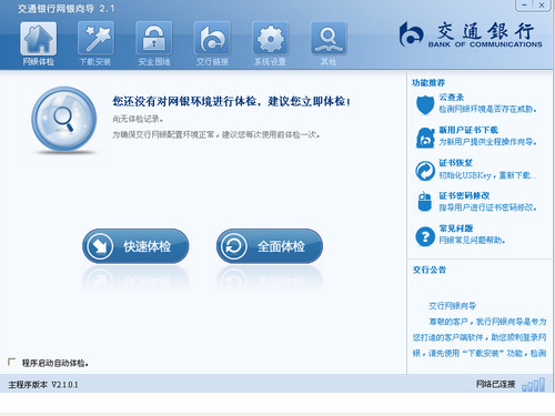 交通银行推出的网上银行专用客户端软件。下载安装网银向导,通过其中的安装向导功能,可为您安装USBKey驱动程序和安全控件、优化调整您的IE浏览器设置,为您解决密码无法输入、USBKey证书无法登录、部分页面无法打开等问题。协助您更顺利地登录交通银行。