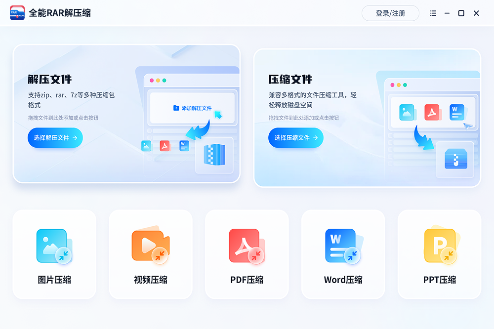 全能RAR解压缩是一款支持批量解压RAR、ZIP、7Z等多种格式压缩包的软件,只需用户导入压缩包文件,即可一键快速解压。此外,软件也支持将设备中的视频、图片、音频等文件进行一键压缩,释放设备空间。