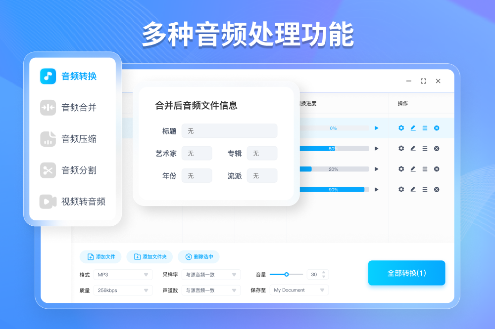 简鹿音频格式转换器,旨在帮助用户轻松转换音频文件的格式。它支持多种常见的音频格式,包括MP3、WAV、AAC、FLAC、OGG等,可以满足用户在不同场景下的需求。 【功能介绍】 音频转换器:音频格式转换器、音乐格式转换MP3、音乐转换器、歌曲格式转换,支持多种音频格式转换MP3 视频转音频:MP4转MP3、m4s转MP3、m4p转MP3,支持视频提取音频 音频压缩:音频无损压缩,MP3压缩,同时支持音频合并和音频分割 批量转换:用户可以同时转换多个音频文件 输出配置:包括采样率、比特率、声道等参数 高品质转换:转换过程中保持音频质量,确保输出文件与原始文件具有相同的质量水平。